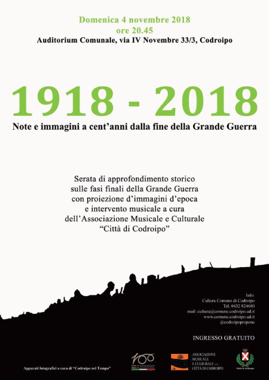 Domenica 4 novembre 2018 alle ore 20.45 nell’Auditorium comunale di via IV novembre, 1918 – 2018. Note e immagini a cent’anni dalla fine della Grande Guerra, serata di approfondimento storico sulle fasi finali della Grande Guerra, con l’intervento musicale del Gruppo Fiati della Scuola di Musica “Città di Codroipo”, diretti dal m° Elena Paroni.