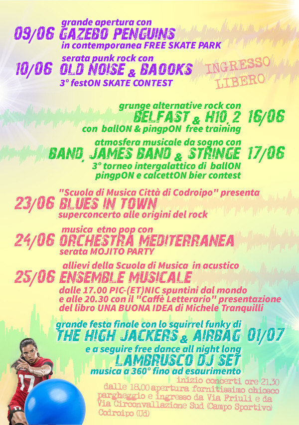 Venerdì 23 giugno 2017 alle 21.00ai campetti comunali di Codroipo, i dipartimenti di moderna e jazz, con la speciale partecipazione della Big band “Città di Codroipo” presenteranno il concerto “Blues in town” in FestON.
