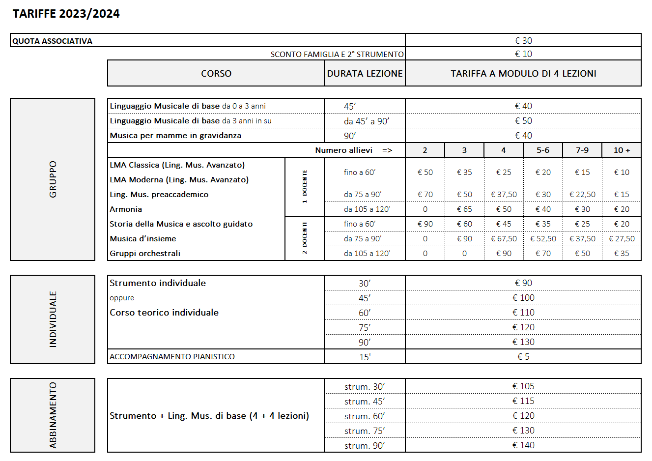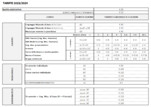 TARIFFE CORSI 2023/2024 (delibera Consiglio Direttivo del 18 luglio 2023)