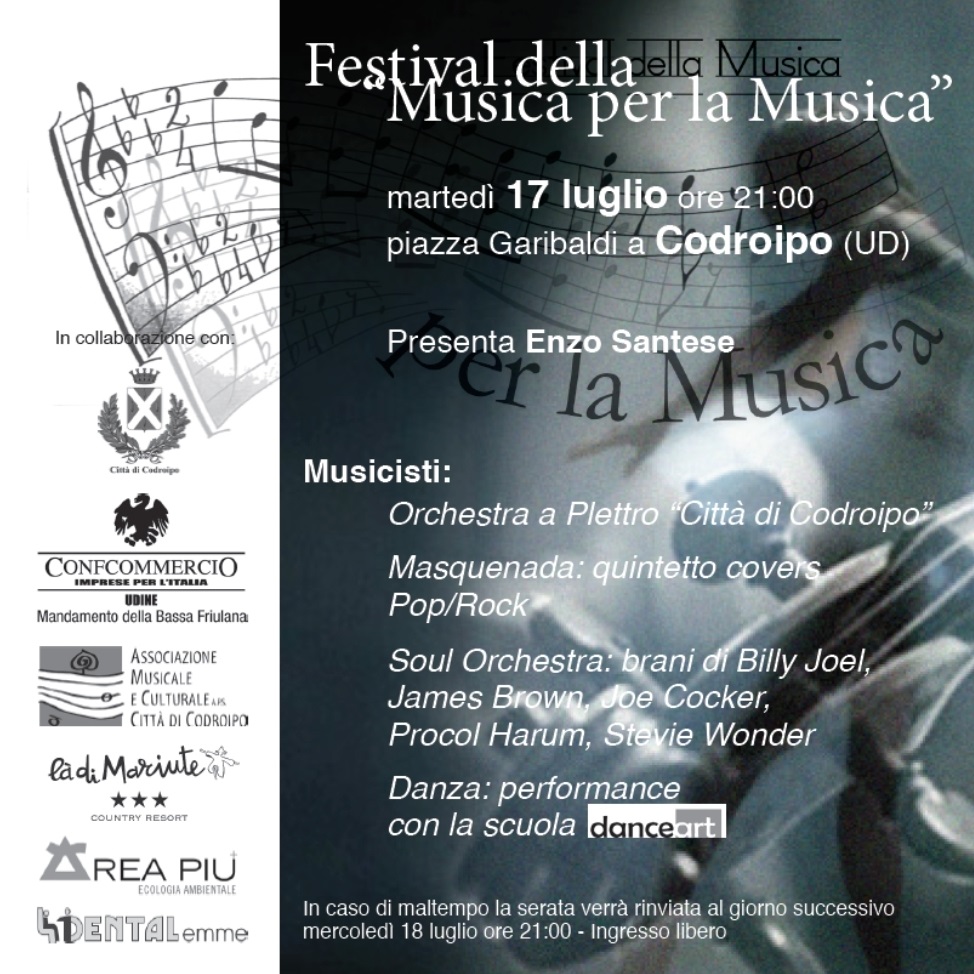 Martedì 17 luglio 2018 alle ore 21.00 in piazza Garibaldi a Codroipo, “Festival della Musica per la Musica”, con la partecipazione di allievi e docenti della Scuola di Musica.