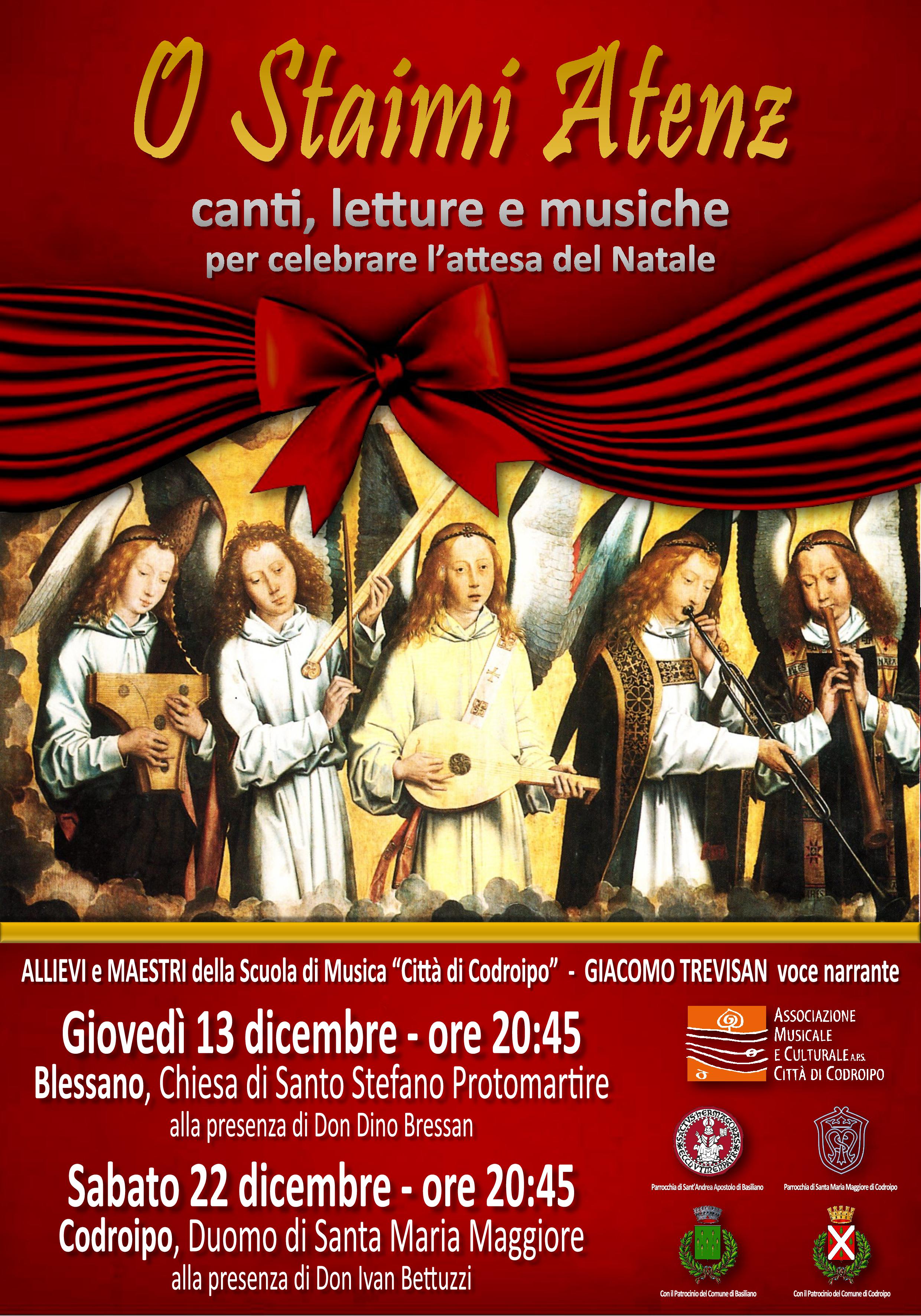 O staimi atenz. Canti, letture e musiche per celebrare l’attesa del Natale, progetto del dipartimento di classica, in collaborazione con il dipartimento di linguaggio musicale. Giovedì 13nella chiesa di S.Stefano Protomartire a Blessano di Basiliano, sabato 22 nel duomo di Codroipo alle ore 20.45.