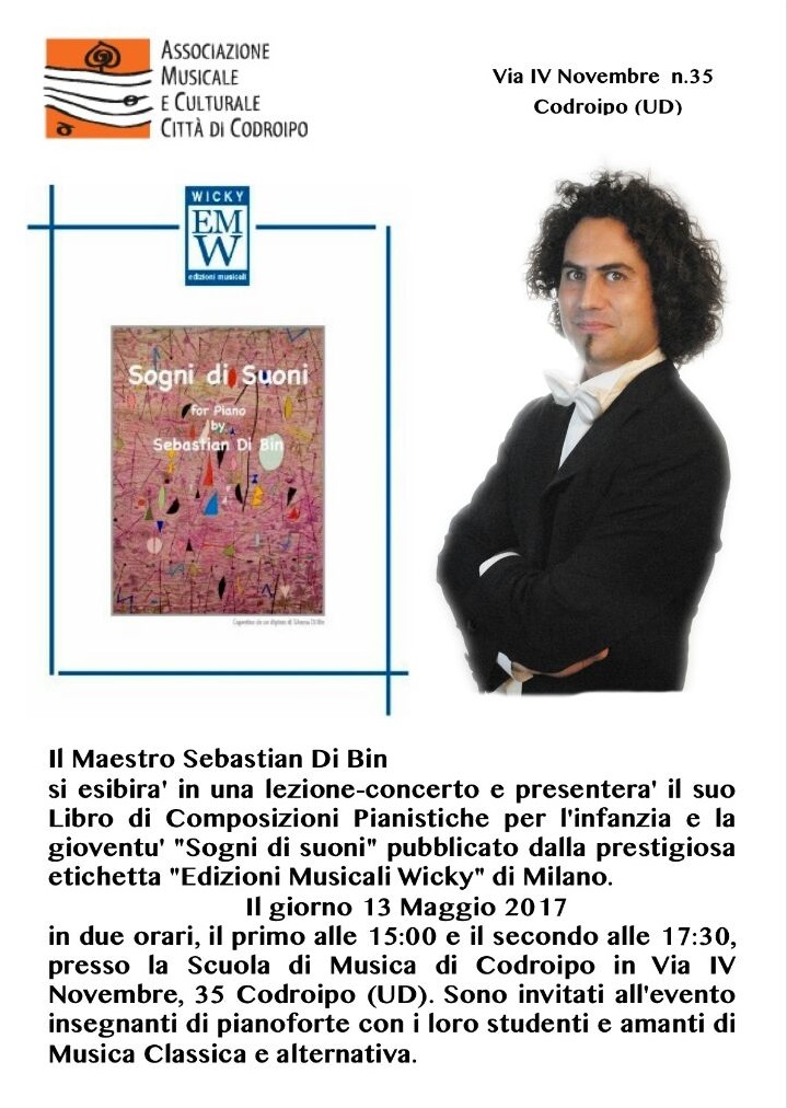Sabato 13 maggio 2017 in due orari, alle 15.00 e alle 17.30, il maestro Sebastian Di Bin si esibirà in una lezione-concerto e presenterà il suo libro di composizioni pianistiche per l’infanzia e la gioventù “Sogni di suoni”. Nella Sala Concerti della Scuola di Musica “Città di Codroipo”, con la partecipazione degli allievi delle classi di pianoforte della Scuola, sono invitati docenti di pianoforte, studenti, amanti della musica Classica e alternativa.