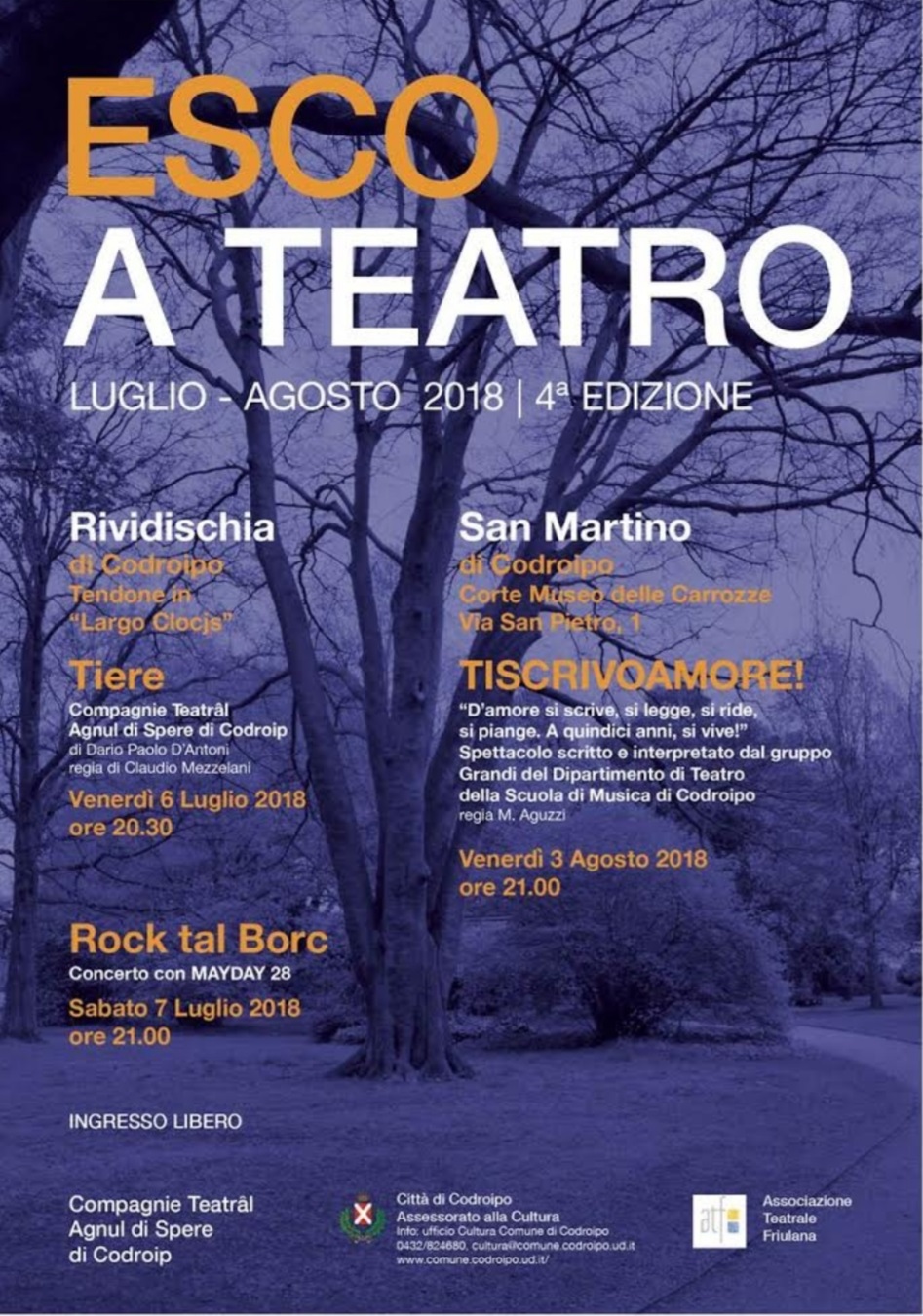 Venerdì 3 agosto 2018, ore 21.00 nella corte del Museo delle carrozze di San Martino di Codroipo, Tiscrivoamore, spettacolo del gruppo di Teatro, ideato e creato dai ragazzi, con la regia di Monica Aguzzi. Ultimo evento della rassegna “Esco a Teatro”, organizzata dalla Compagnia Teatrale Agnul di Spere.