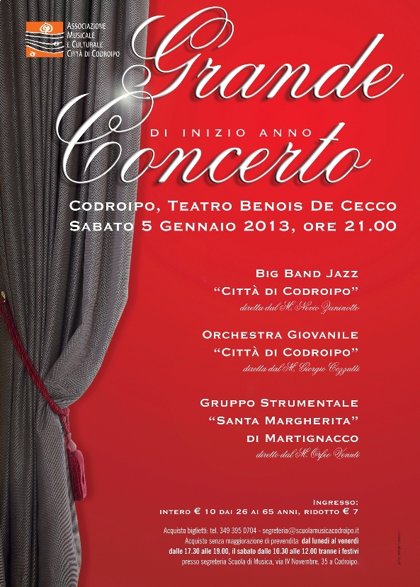 L’Associazione Musicale e Culturale “Città di Codroipo” è lieta di InvitarVi al Grande Concerto di inizio anno che si terrà presso il Teatro Benois-De Cecco di Codroipo.
