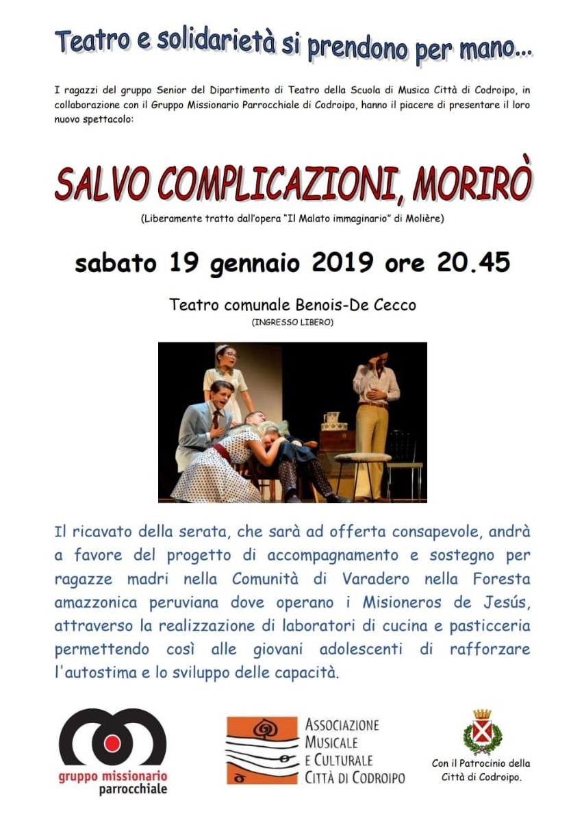 Sabato 19 gennaio 2019, alle ore 20:45 al Teatro Benois-De Cecco di Codroipo, Salvo complicazioni morirò, commedia brillante liberamente tratta dal Malato immaginario di Moliére. Gruppo Senior del dipartimento di Teatro, regia di Monica Aguzzi.