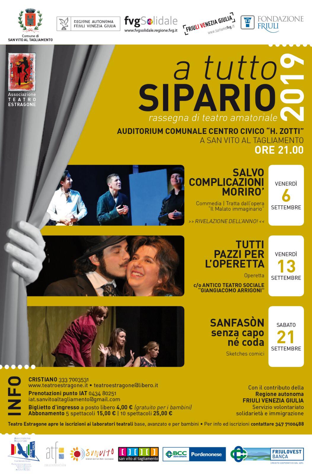 Venerdì 6 settembre alle ore 21 presso l’Auditorium Comunale Centro Civico “H. Zotti” a San Vito al Tagliamento (Pordenone), Salvo complicazioni, morirò, spettacolo a cura del gruppo Senior del dipartimento di teatro, su testo tratto dal Malato immaginario di Moliére.