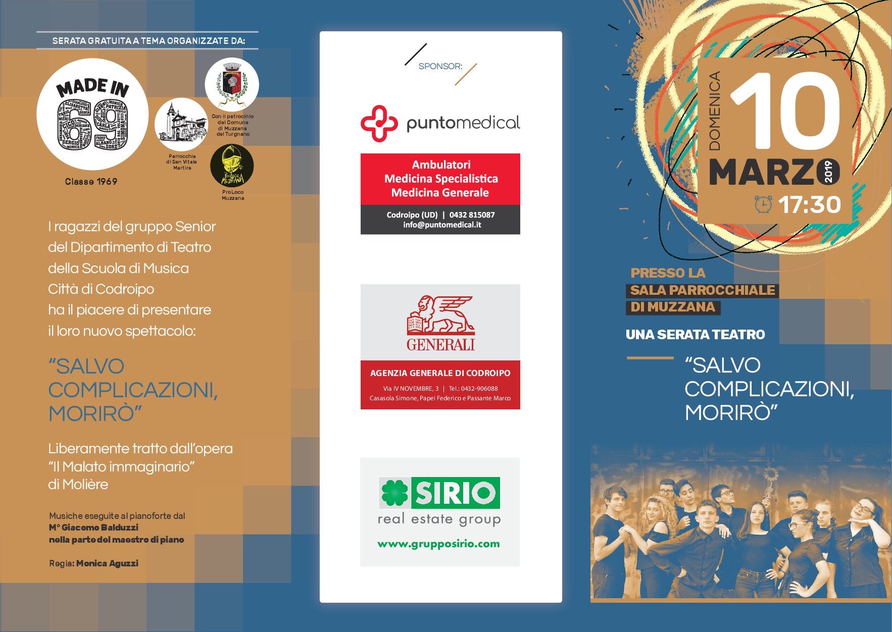 Domenica 10 marzo 2019, alle ore 17:30 presso la Sala Parrocchiale di Muzzana (Udine), Salvo complicazioni, morirò, commedia brillante liberamente tratta dal Malato immaginario di Moliére. Gruppo Senior del dipartimento di Teatro, regia di Monica Aguzzi.